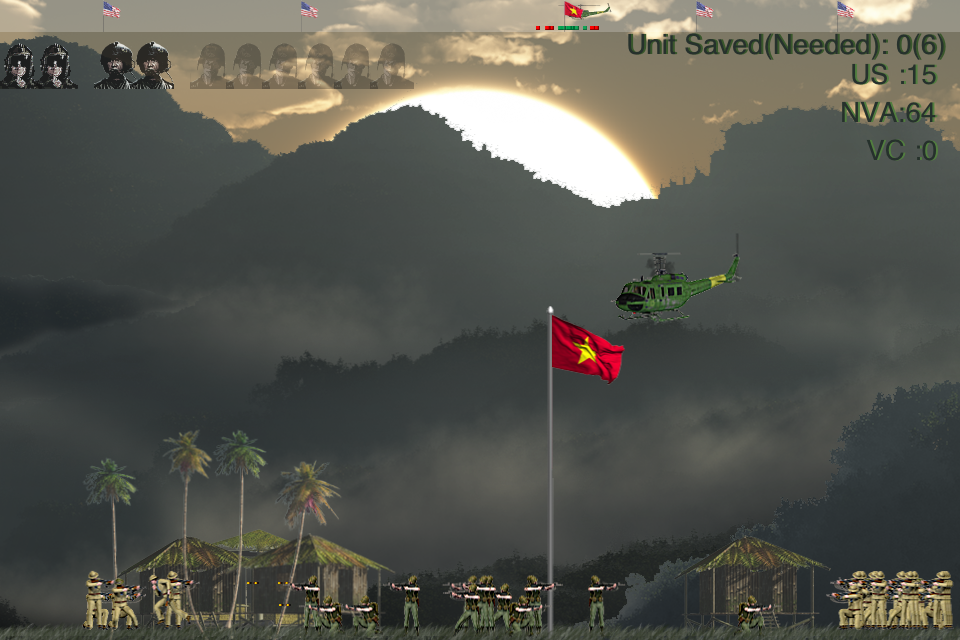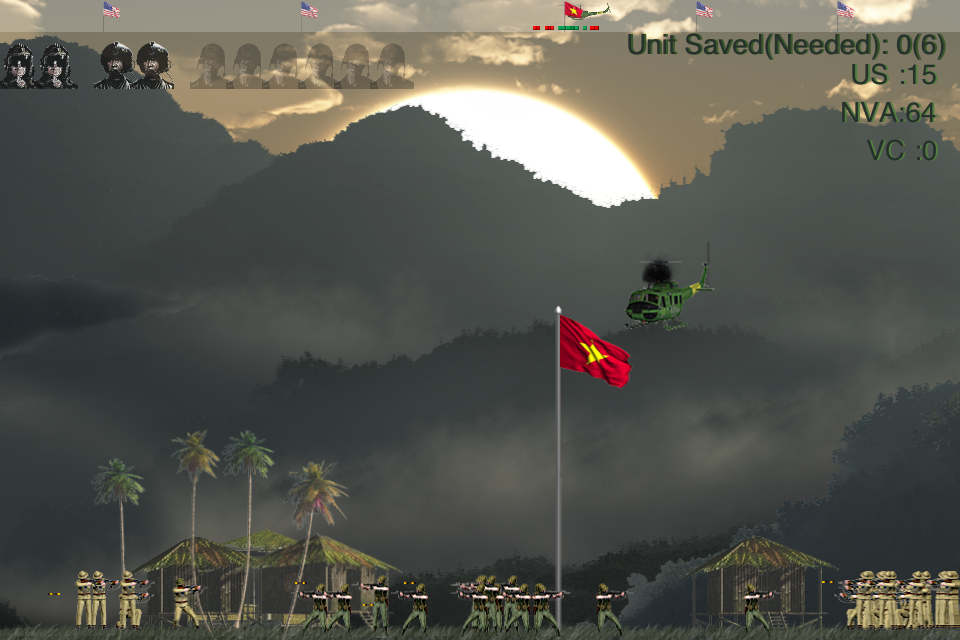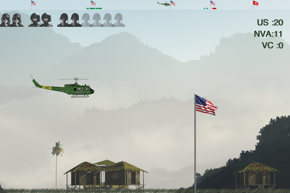 Prepare for war! In the heat of the Vietnam War it's your job to pilot a Huey helicopter to transport American soldiers into and out of hostile territory to help bring an end to this conflict. Fly troops from our headquarters and bases to outlying North Vietnamese Army bases to tackle their forces and take control of villages. Rescue troops if they're hopelessly surrounded by enemy forces and use the guns and rockets on your chopper to back-up the ground troops that you've transported. With your skill we can win this war!
