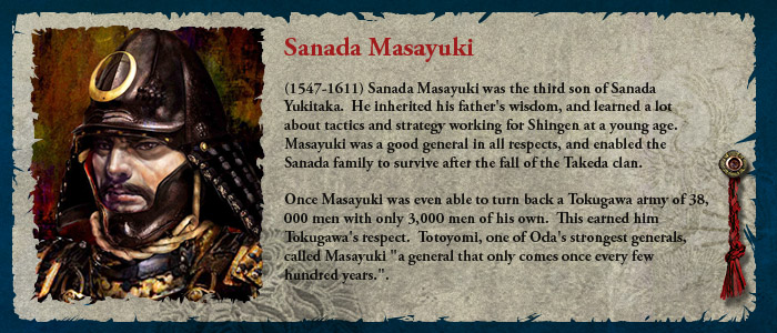 Once Masayuki was even able to turn back a Tokugawa army of 38,000 men with only 3,000 men of his own.  This earned him Tokugawa's respect.  Totoyomi, one of Oda's strongest generals, called Masayuki 'a general that only comes once every few hundred years.'